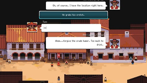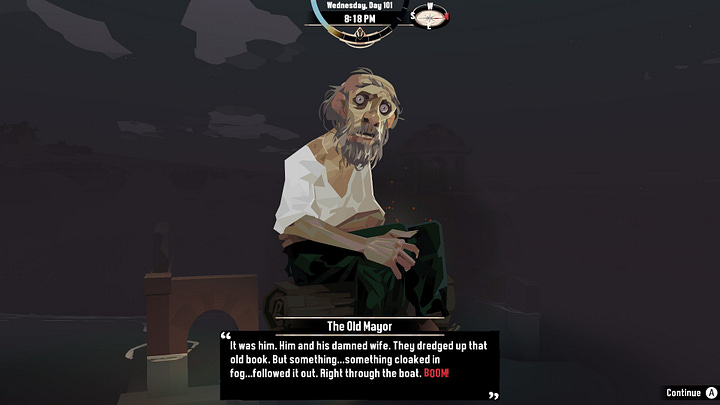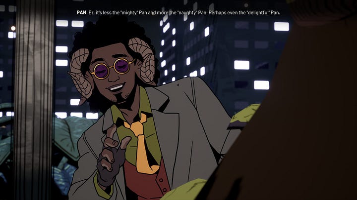 “Roleplaying”: I wished they would’ve stuck with the original subtitle of “Adventure Musical” with it being more like a visual novel with no lose state— roleplaying is such a loaded term and gamers/nerds as we know can be a pedantic bunch. I recognize the parallel between Stray God’s Kickass, Clever, Charming and (my favourite game I can’t recommend) Alpha Protocol’s 3 JBs —Jason Bourne, James Bond, Jack Bauer—dialogue options where the player needs to make a quick decision under time constraint. Unlike Alpha Protocl where you get an immediate pay-off from the dialogue choice, it being a song in Stray Gods muddied the choice and consequence for me (kinda like what I’ve seen of Fallout 4’s simplified dialogue options where players don’t always know what they’re picking).