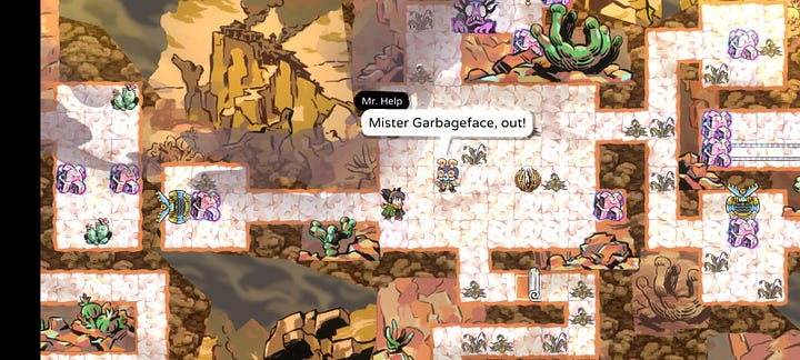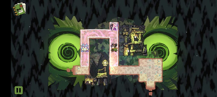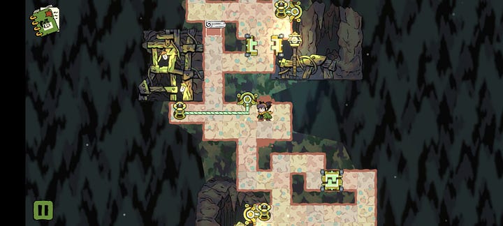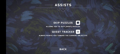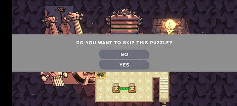 Mobile UX Woes: One of the assists/accessibility options you can turn on places a white square on the board which pops up an option to skip the current option when stepped on. (The other shows you the direction of the current objective and I recommend just leaving that on.) With the smaller form factor and repeated touching and swiping, I might have fallen into a UX trap waiting to happen—unintentionally skipping the entire final phase of the final boss. Since there’s an entire separate menu, a “Skip Puzzle” button there would have less chance of being hit by accident.