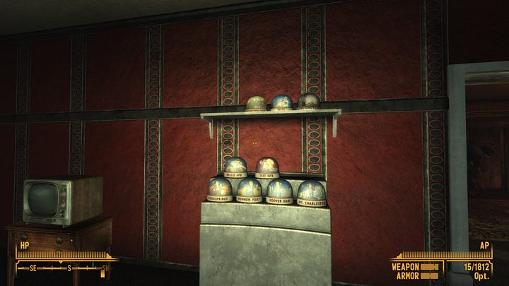 Encumbrance: My carry weight woes were mostly managed when I fixed the broken restored content earlier. However, 2 of the DLCs strips the player of all inventory only to return all of it on completion, this will result in being overburdened and unable to run or fast travel. Fortunately a reward from Old World Blues was an item that allows teleportation to the home base—I also made that my permanent home base complete with sorted containers and companions tagging along.