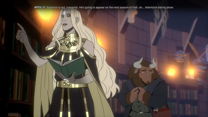 Visuals & Style: The minimally animated, clean art really stood out for me. The Greek mythology theming has been explored recently in games & other media. With the revelation at the end of the game, perhaps there is an opportunity to explore the gods’ struggles with modern society—Fables/Wolf Among Us was what came into my mind.