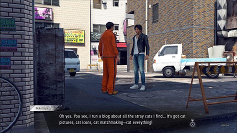 Random Thug Encounters: These feel like unnecessary friction—a holdover from the main series. Though the story eventually explains why Yagami keeps getting jumped, they’re still speedbumps between the good bits. (Maybe I should just lower the combat difficulty to bulldoze through them.)