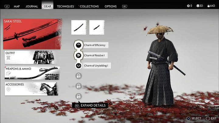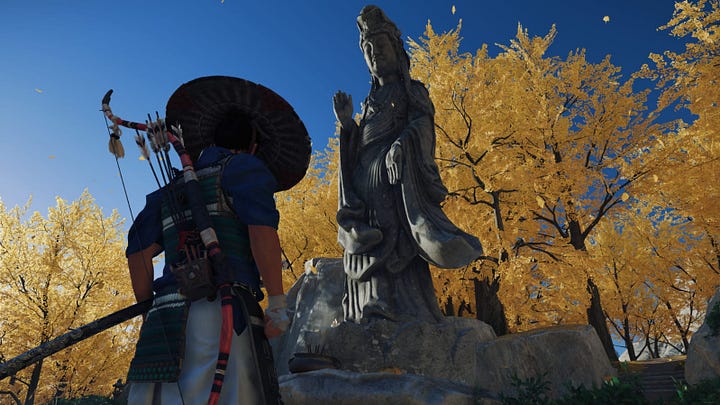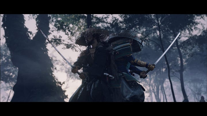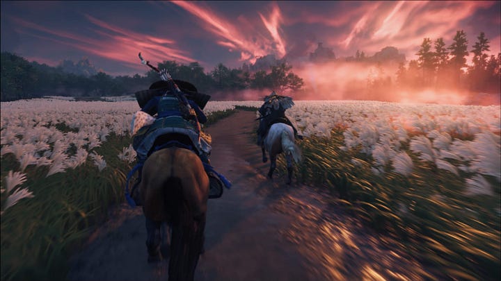 Constraints: I was always the enjoyer of mission constraints in older AC games as a subtle way to both nudge players to use the various gameplay systems and abilities and rewarding them when they gain mastery. Tsushima has some of that. (The other old AC thing the game borrows is constraining the player to mission areas/setups. I am ambivalent to that but feels it simplifies setups with my dev hat on.)